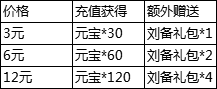 累计充值100元宝,可获得:马超礼包*1累计充值300元宝,可获得:马超礼包*2